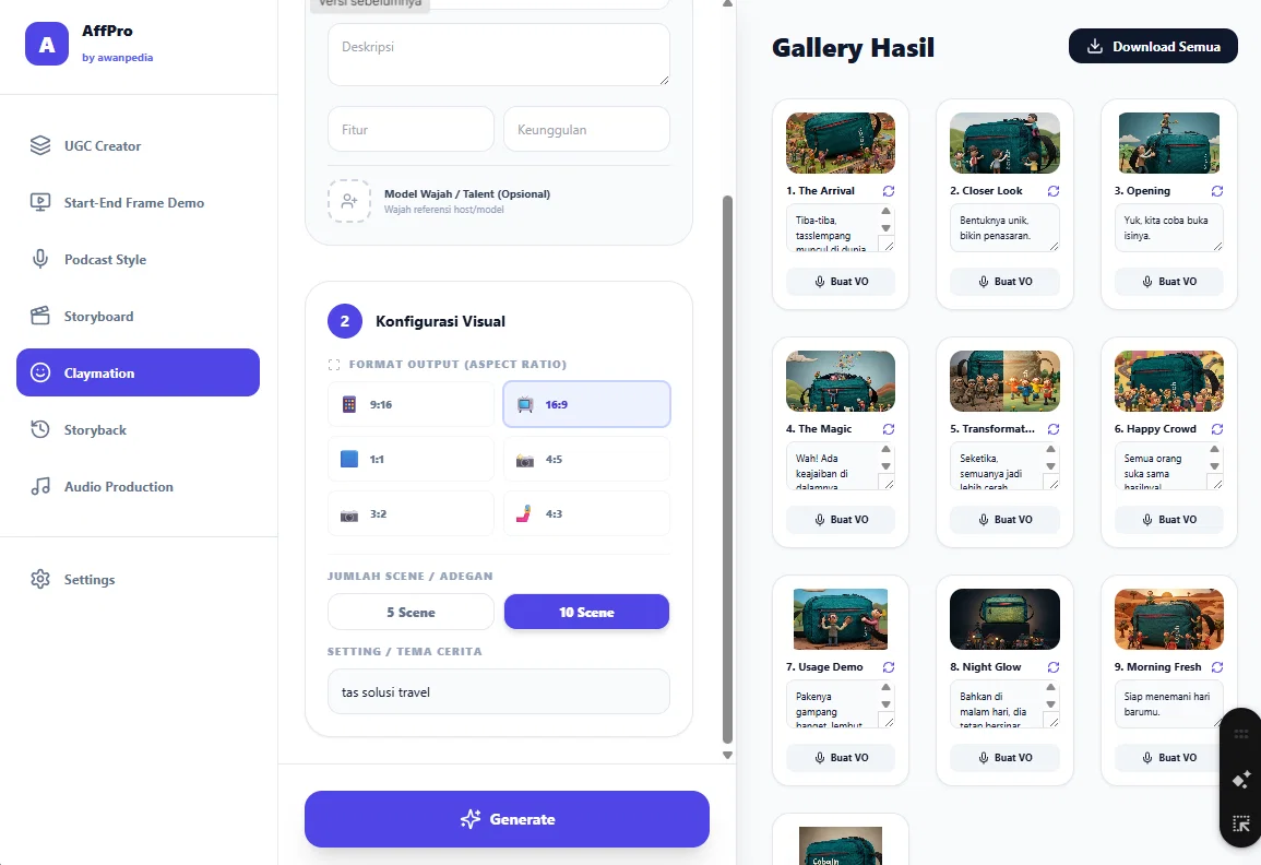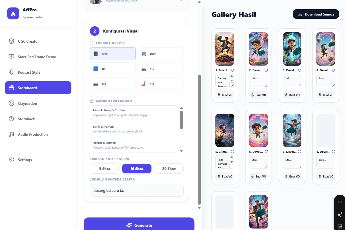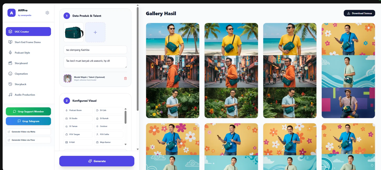 Butuh ratusan konten UGC, poster, dan voice over untuk jualan? AFFPRO bikin semuanya dalam satu dashboard.